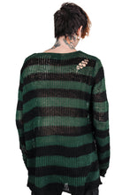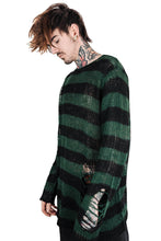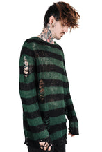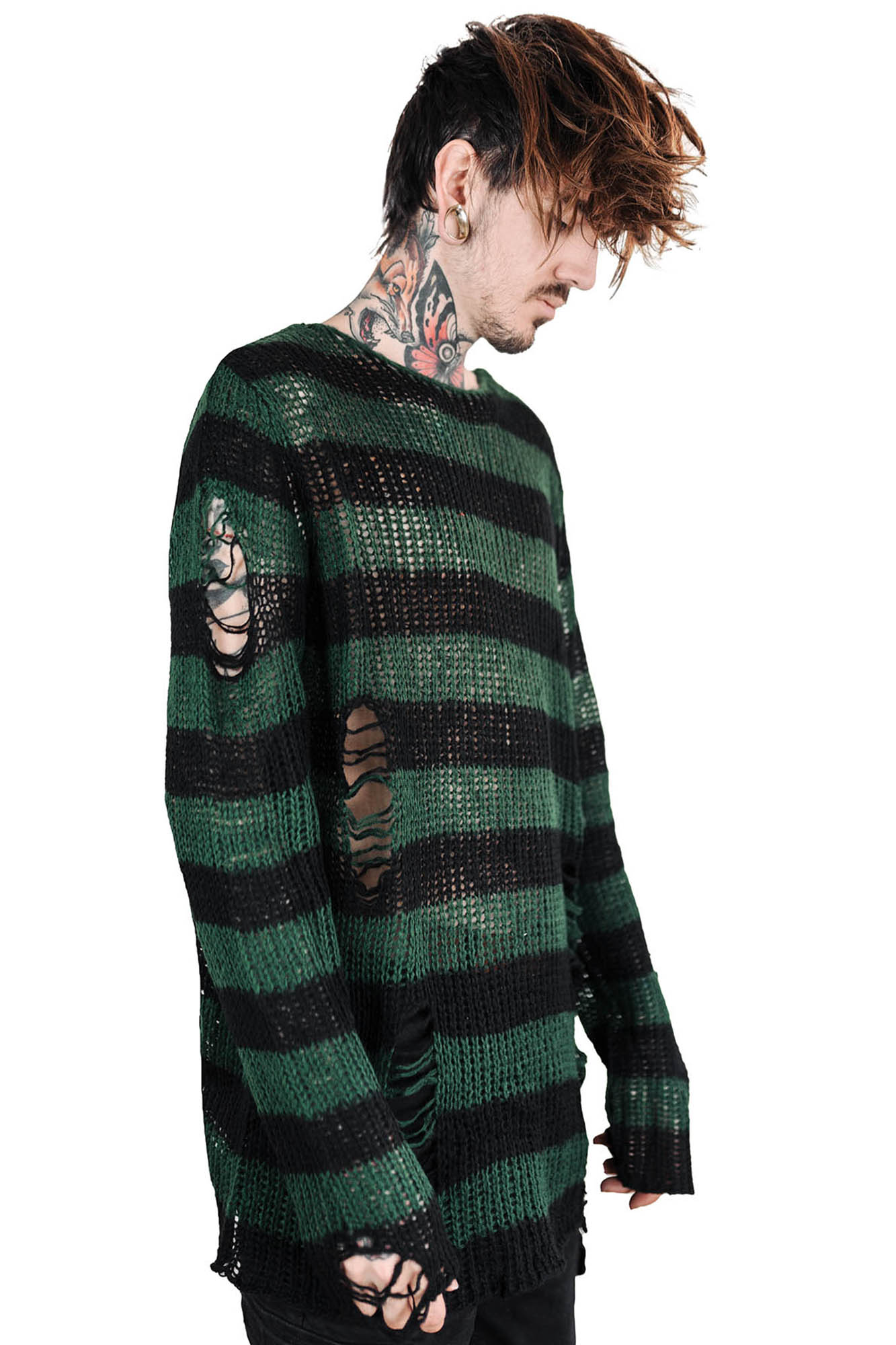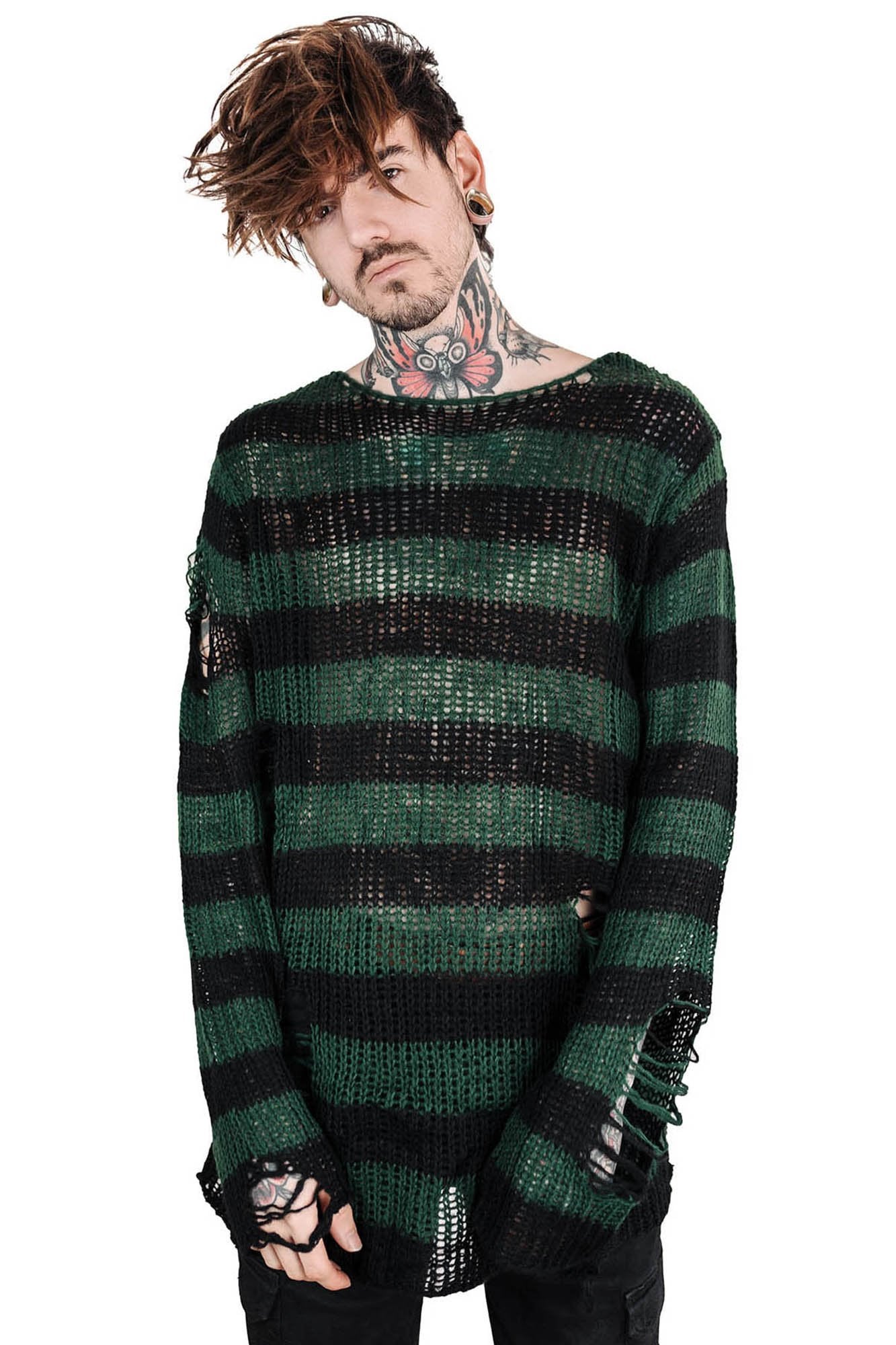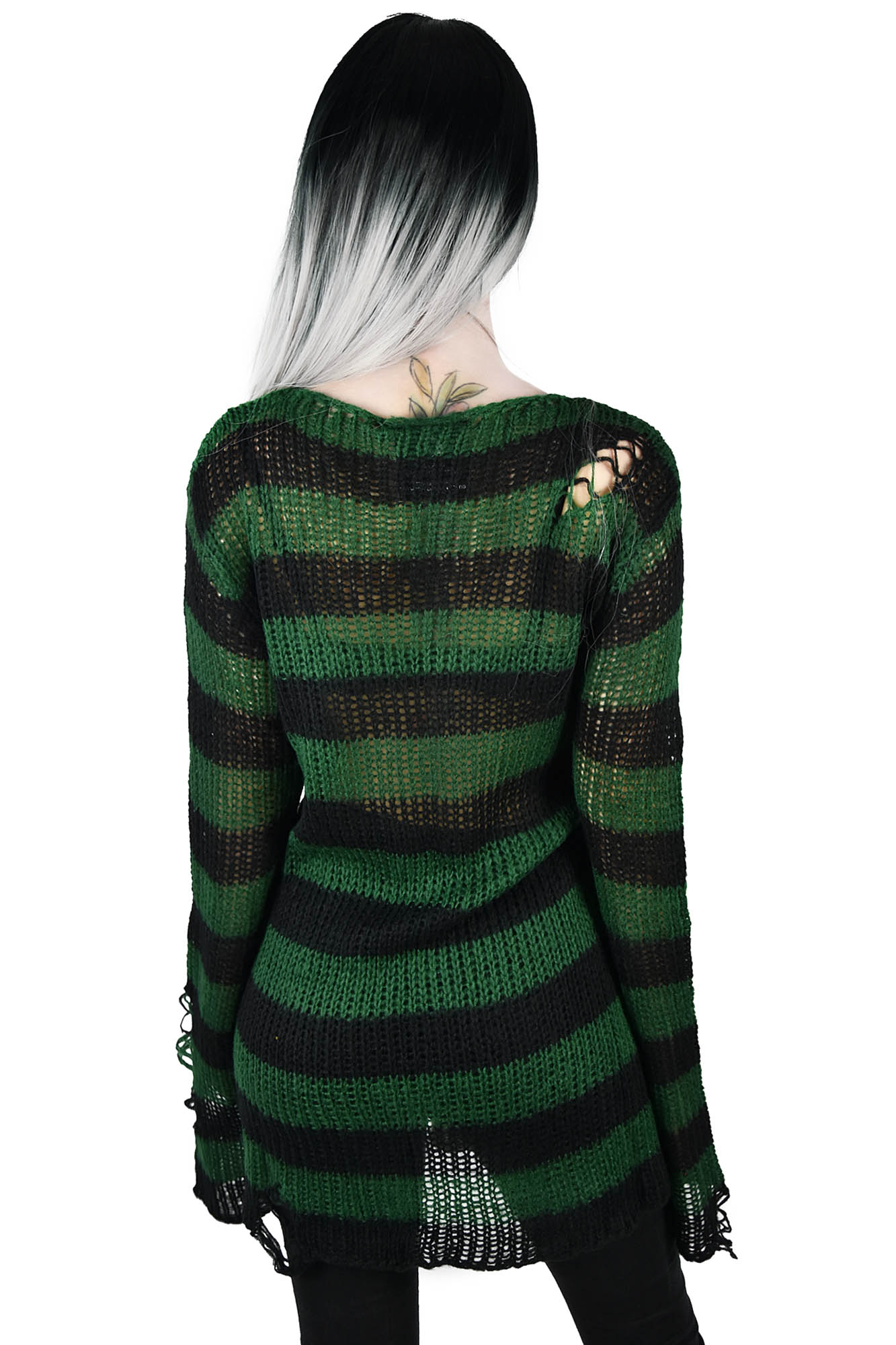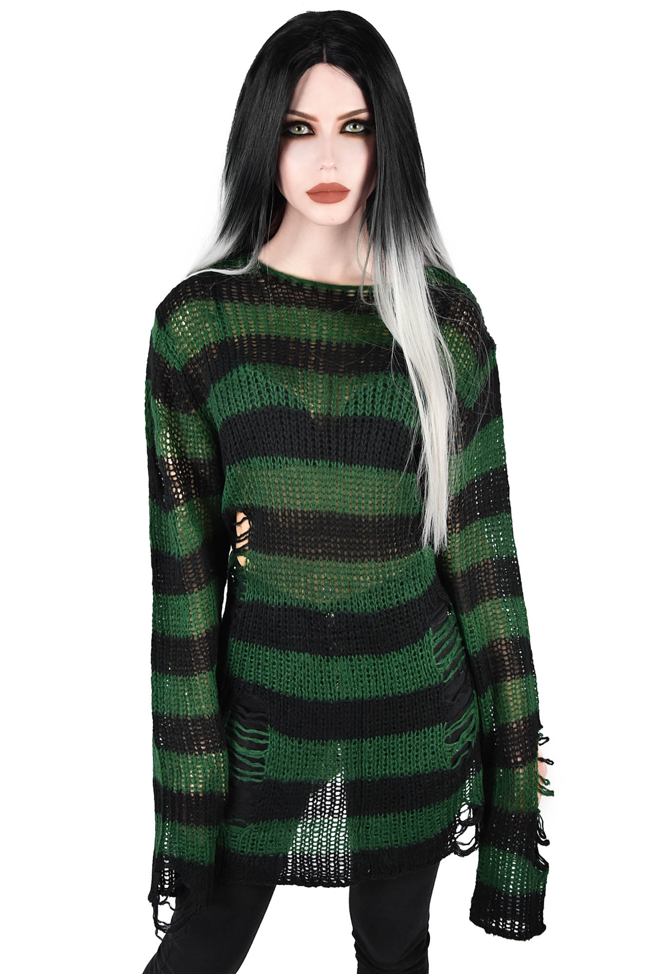 Channeling some 90s grunge with the 'Absinthe' soft-knit sweater, perfect for layering - or wear as a statement piece. Contrasting black and muted-green striped body; with extra long length so can easily be dressed up or down. With distress detailing and low neckline. Ideal for festivals, midnight promenades with the moon and hungover Sundays.