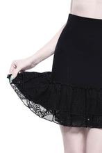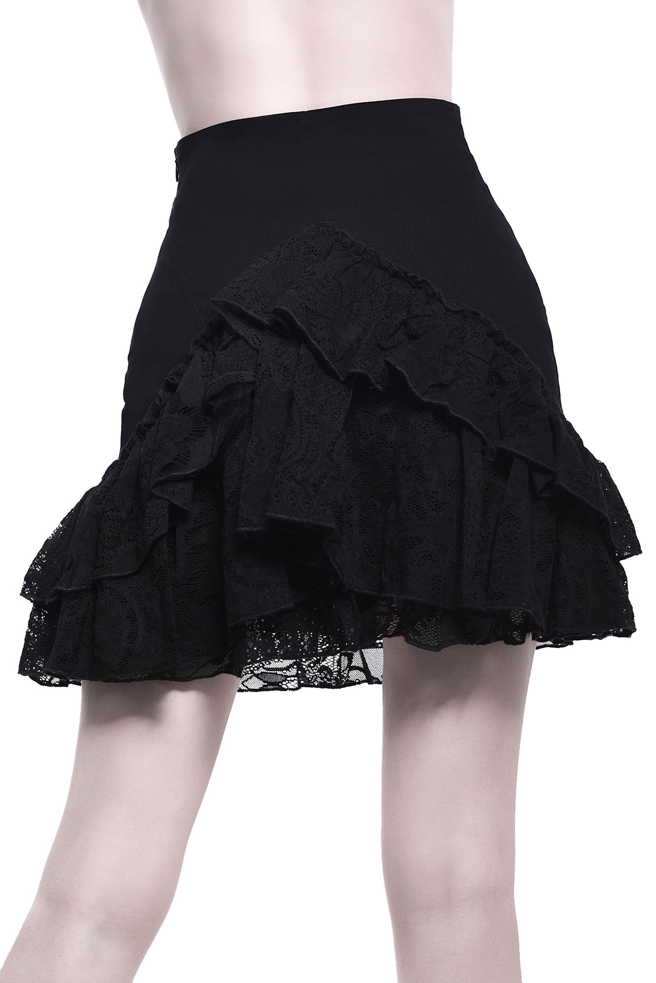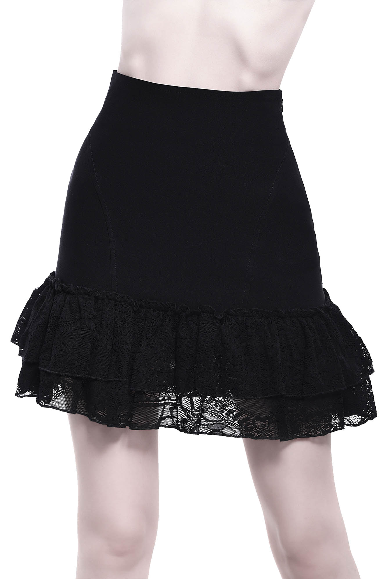 Join me on the adventures into the dark; the 'Adoria' statement skirt is everything you need to swoon. Featuring a woven-stretch fabric body for a flattering fit combined with superior comfort. With a lace ruffle & bustle statement, delicate trims and zipped back for easy on/off. Easy to style and oh-so-versatile - perfect from dusk to dawn.