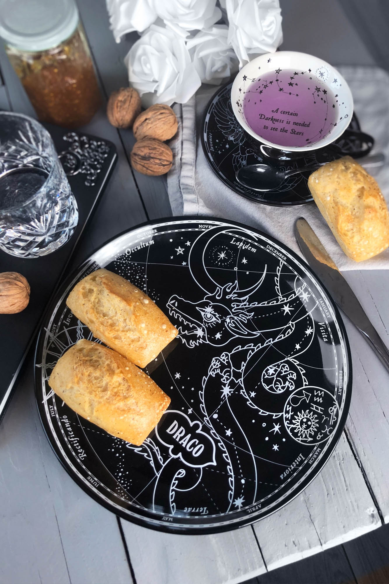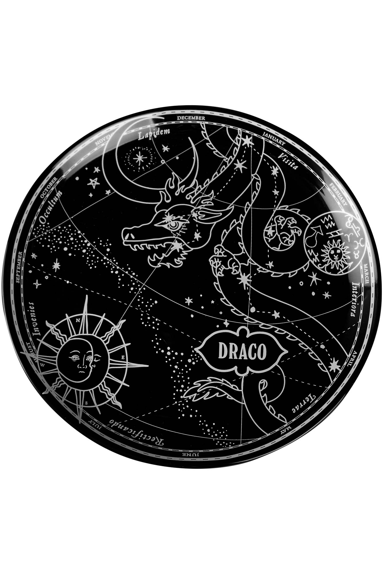 Looking for final touches for your cosmic abode? Our 'Draco' plate is sure to turn some heads! Large size dinner plate with a contrasting motif and black gloss finish. Perfect as a statement serving dish for feasts, large cakes or simply adorned on the wall. ^^ Are ye ready for a romantic dinner date with the cosmos?